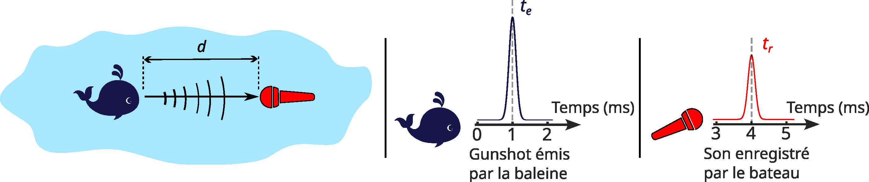 For whales, one of the most characteristic sounds is called a gunshot. This is a very clear click produced by the whale that sounds like a gunshot (you can listen to it here). This sound travels particularly well in water and is very distinct in recordings. So we have three elements: a whale emitting a gunshot, a recording of this sound from the boat, and a question: how can we use this recording to find the distance d between the boat and the whale?