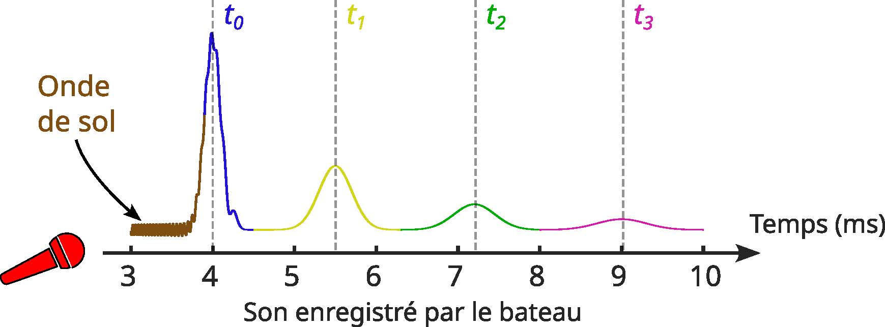 So here's my question: in this situation, is there a method for estimating the position of a whale? I chose the example of whales today, but I could just as easily have thought of a fishing boat looking for a school of fish, or a military vessel scanning the ocean to locate a submarine. In all these cases, the principle remains the same and is based on passive sonar methods. The boat is equipped with an underwater microphone, called a hydrophone, which records the sounds propagating in the water. When the object being searched for emits a sound, that sound propagates and can be picked up by the hydrophone.