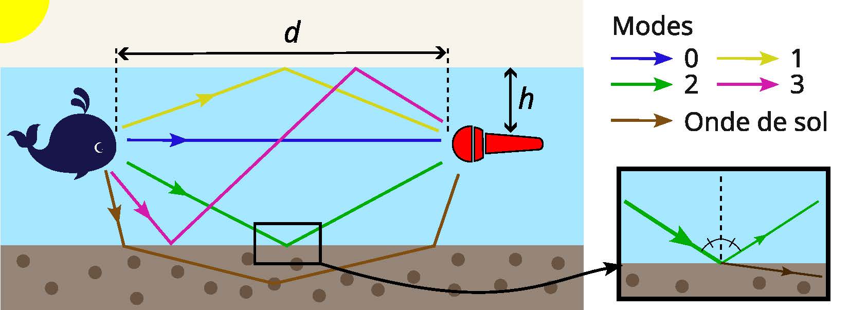 Result: to travel from the whale to the hydrophone, the wave can take several paths. These are referred to as propagation modes. The direct, straight path is called mode 0, but the sound can also bounce off the surface (mode 1), the bottom (mode 2), and then combine several successive reflections (modes 3, etc.). The received signal can thus be broken down into a theoretically infinite sum of contributions corresponding to these different modes. In practice, successive reflections dissipate energy and, beyond three or four, the signal becomes too weak to be detected.