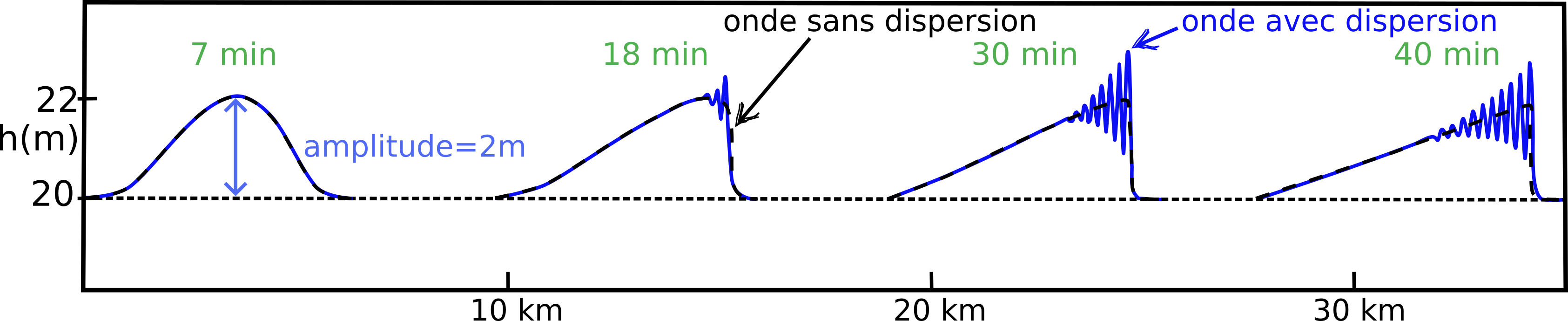 Pour celles et ceux qui veulent aller plus loin, l’un des outils techniques utilisés pour décrire cette dispersion sont les équations de Serre Green-Naghdi11 . On peut toutefois donner l’intuition de façon accessible de ces effets dispersifs, avec le schéma suivant qui montre l’évolution de la forme de l’onde dans le temps et dans l’espace avec des grandeurs typiques. Deux courbes sont fournies : l’une avec un modèle sans dispersion (courbe noire, « très simple »), et l’autre avec un modèle contenant de la dispersion (courbe bleue, où des « oscillations » s’amplifient au cours du temps).